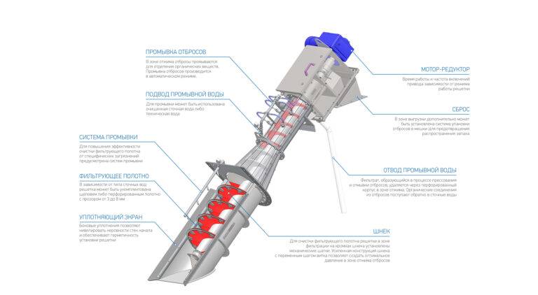 В нижней части решетки установлено щелевое или перфорированное сито. По мере прохождения сточных вод через сито, отбросы задерживаются на поверхности фильтрующего полотна. Для очистки полотна в зоне фильтрации шнек оснащен щеткой. В верхней части решетки предусмотрены зоны промывки и отжима отбросов.