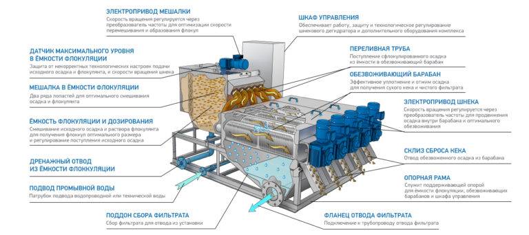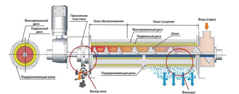 Механизм самоочистки для стабильной и беспрерывной работы. Механизм самоочистки обезвоживающего барабана состоит из двух типов специальных дисков, которые при вращении шнека обеспечивают самоочищение поверхности фильтрации. Поэтому оборудование может работать непрерывно без остановок и каких-либо затратных процессов на очистку фильтровальных пор.