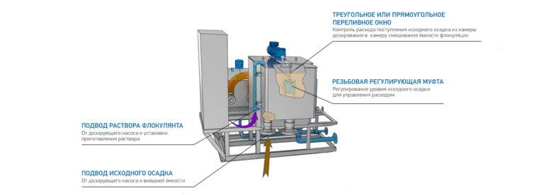 Низкие эксплуатационные затраты. За счет использования приводов шнеков с низкой номинальной мощностью (до 2,2 кВт) с низкими оборотами и управлением через преобразователи частоты, удается достичь минимального энергопотребления. Низкое потребление флокулянта достигается за счёт регулирования скорости перемешивания его с осадком, возможности визуального контроля и последующей оптимизации потребления.