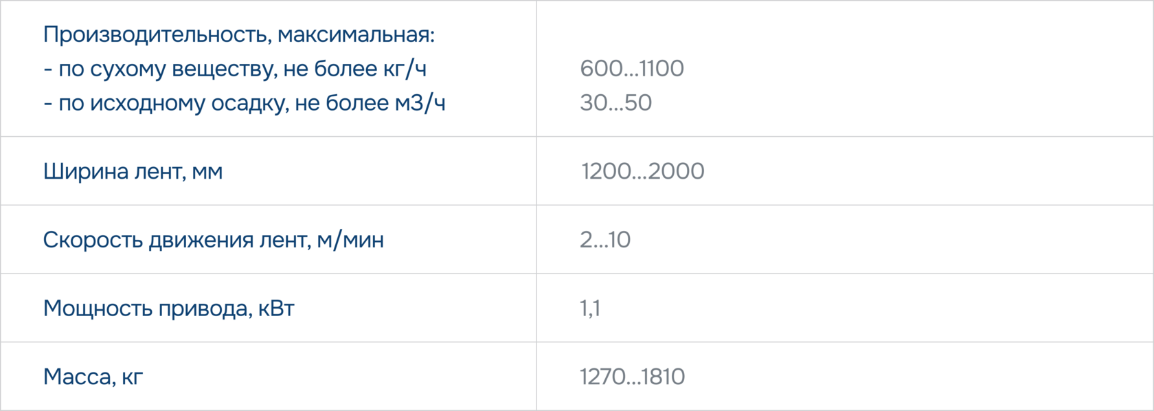 Ленточный сгуститель осадка предназначен для механического обезвоживания осадков сточных вод, а также осадков водоподготовки и производственных шламов. Сгустители также могут использоваться в качестве первых ступеней обезвоживания в комплекте с фильтр-прессами для повышения производительности фильтр-пресса по исходному осадку. Сгустители предназначены для использования с осадками сточных вод с рН=6,0+9,0.